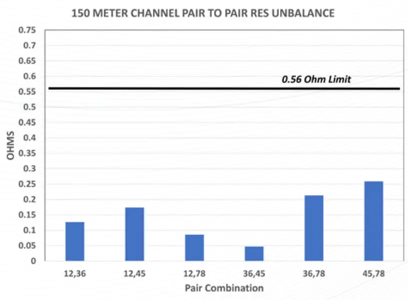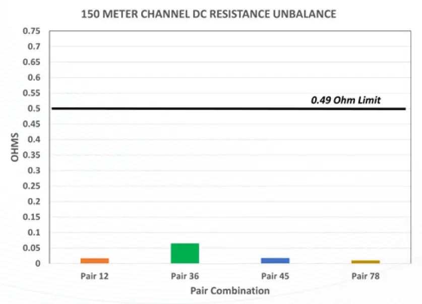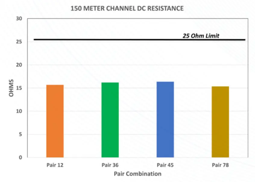 Extended Reachケーブルは、最大90Wを供給可能なPoE++に準拠しており、DC抵抗・抵抗アンバランス・ペア間抵抗アンバランスの各要件も満たしていることが確認されています。
