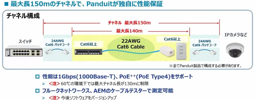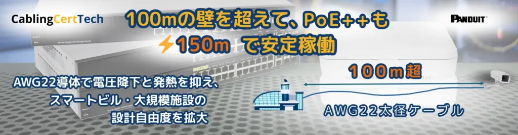 太径ケーブル延長(Panduit Extended Reach) | Cat6(22AWG)Extended Reachケーブル | ケーブル単体で150m動作を確認(規格外だが検証データ公開済み)。PoE++・LP認証対応。 |