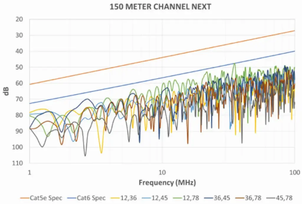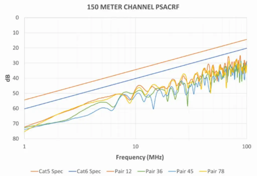 さらに詳細測定では、NEXT、PSACRF、RLといった重要な伝送性能パラメータも150mで要件を満たすことが示されています。