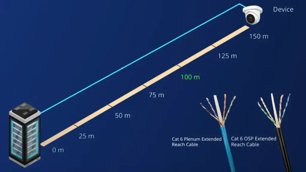PoEエクステンダーやメディアコンバータなどの中継器を必要とせず、ケーブル単体で150mまでの安定動作を実現できます。