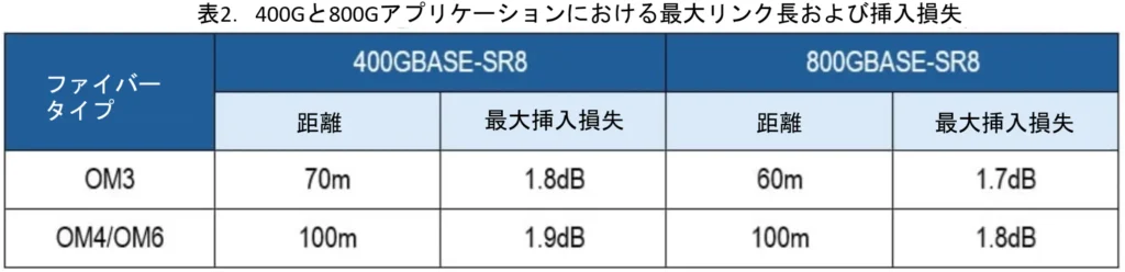 まず、800Gへの移行で最も影響が大きいのは「配線設計」と「損失管理」です。特にマルチモード環境では、従来の400G設計をそのまま流用すると、リンク長や挿入損失の制約により対応できないケースが発生します。