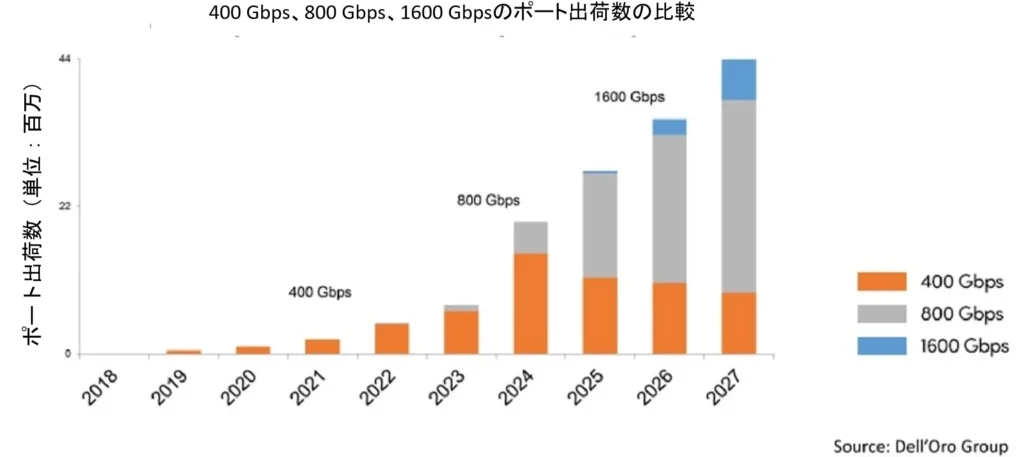 調査会社Cignal AIの最新のOptical Components Reportによると、800Gは2025年において市場で最も急速に成長するセグメントとなり、1.6Tへの移行は第3四半期に開始され、2026年および2027年にかけて加速していくとされています。これは、Dell’Oro Groupが公表した400G、800G、および1.6T(1600G)のポート出荷予測と一致しています。