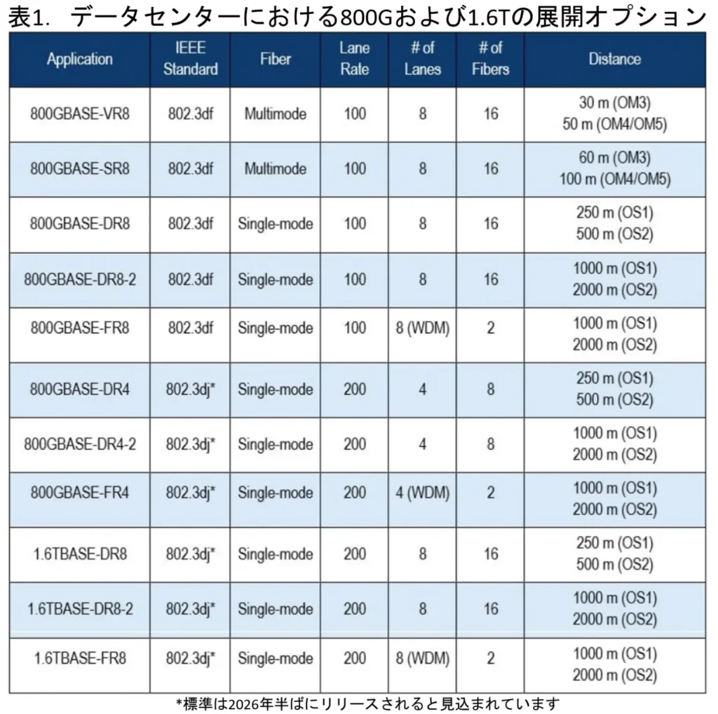 表1は、データセンター環境において800Gおよび1.6Tを展開するためのさまざまなオプションを概説しています。