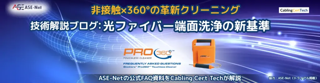 【注記】本記事は、ASE-Netのサポートを受け、MicroCare社の技術資料「Sticklers™ Pro360°™ Touchless Cleaner FAQ」(Rev.24011, ©2024 MicroCare)を基に、Cabling Cert Tech(ケーブリング・サート・テック、略称:サートテック)が独自の視点で作成したものです。