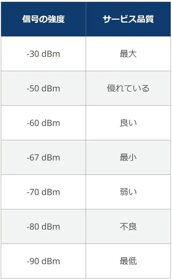Wi-Fi 信号強度はデシベル・ミリワット(dBm)で測定され、負の値で表されます。dBm 値が高い(ゼロに近い)ほど、信号が強いことを示します。強い信号は、データ転送速度の向上と信頼性の高い接続に直結します。通常、-67 dBm 以上の信号強度は、音声や電子メールなどのほとんどのアプリケーションをサポートしますが、ビデオ・ストリーミングでは -50 dBm 以上が推奨されます。-80 dBm 以下では、ほとんどのアプリケーションにとって信号が弱すぎ、接続自体ができない可能性があります。
