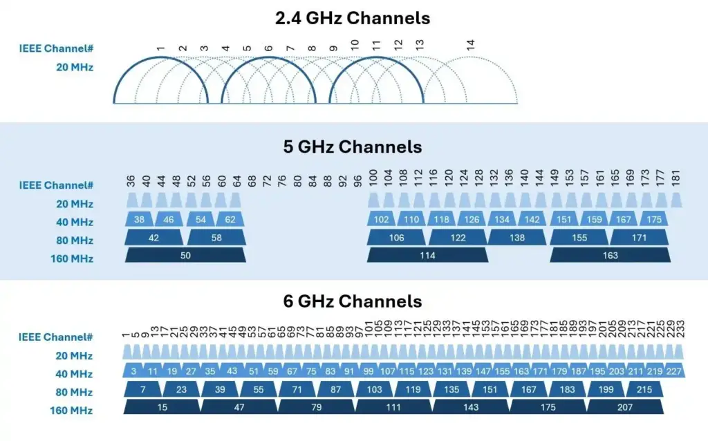 FCC と ITU は、これらの帯域内で Wi-Fi 用に特定の 20 MHz チャンネルを指定しています。2.4 GHz 帯には 14 のチャンネルがあり、5 GHz 帯には 29 のチャンネル、6 GHz 帯には 59 のチャンネルがあります。5 GHz および 6 GHz 帯は重複しないチャンネルを提供しますが、2.4 GHz 帯の多くのチャンネルは重複しています。その結果、干渉の可能性が高まり、通信速度が低下することがあります。利用可能な 14 の 2.4 GHz チャンネルのうち、重複しないのは 1、6、11 のみです。5 GHz および 6 GHz チャンネルは重複しないため、小さい 20 MHz チャンネルを結合して、40 MHz、80 MHz、または 160 MHz の広帯域チャンネルを形成し、スループットを向上させることが可能です。