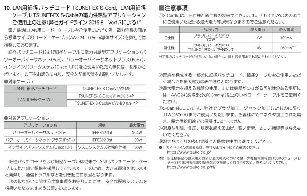 TSUNET-EX S-CordやTSUNET-EX S-Cableは、従来のLANケーブルよりも細い導体を使用しているため、PoE(Power over Ethernet)を利用する際に制限があることをご存じですか?特に、最大電力や最大電流が標準のLANケーブルとは異なり、適切な設計をしないと発熱や電圧降下が発生する可能性があります。