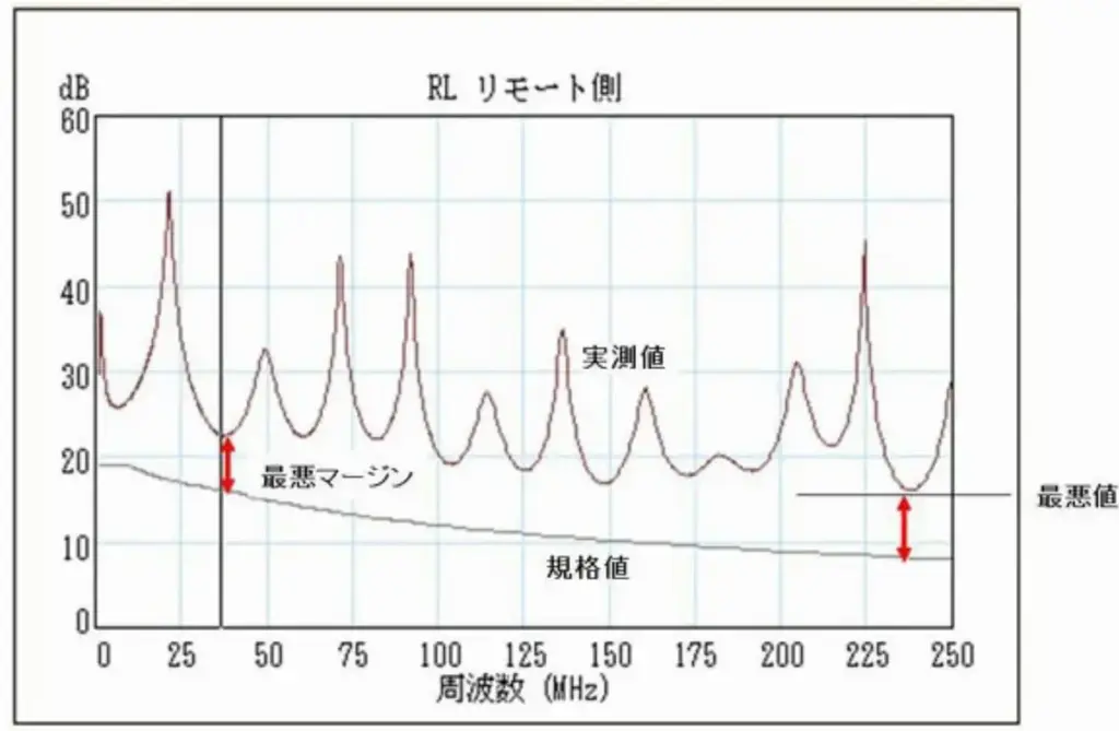 リターンロス測定における最悪マージンの例:本図は、測定値が規格値にどれだけ余裕(バッファ)を持っているかを示しています。最悪マージンは最小の余裕度を表し、配線の信頼性や将来の安定性を判断する重要な指標となります。