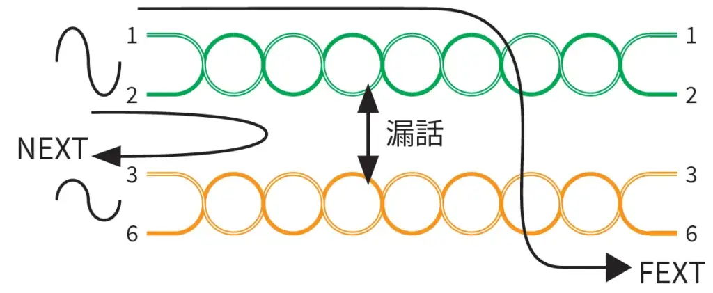NEXT(近端漏話)と FEXT(遠端漏話)の発生イメージ:ツイストペアケーブル内で隣接するペア間に生じる電磁誘導ノイズを模式的に示した図。NEXT は送信側近くでの漏話、FEXT は遠端での漏話を表します。
