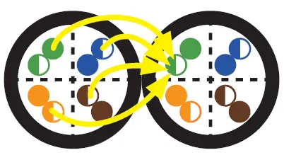 エイリアン・クロストークの影響模式図:本図は、隣接するケーブル間で発生する電磁誘導ノイズが、右側ケーブル内の複数ペアに干渉する様子を示しています。各ペアは外部からのクロストークの影響を受け、信号品質の低下につながります。