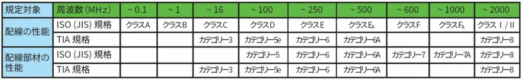 配線性能レベルは、ISO/JIS規格では「クラス」TIA規格では「カテゴリー」 という用語で定義されています。これらはしばしば混同されますが、その概念は厳密に区別されます。