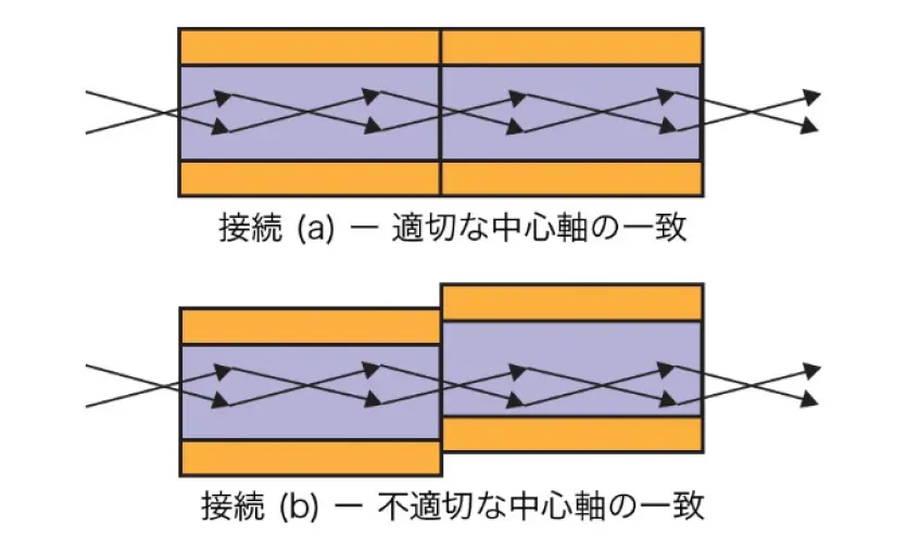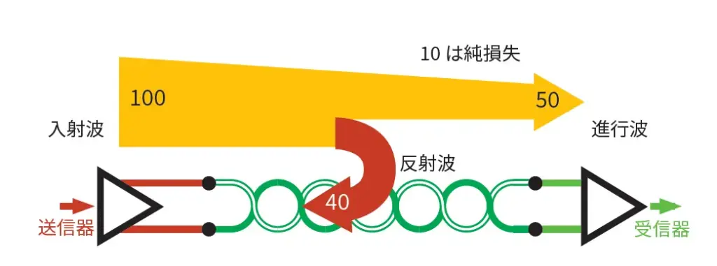 リターンロス発生の模式図:本図は、配線内のインピーダンス変動によって信号の一部が反射し、送信側へ戻る現象(リターンロス)を示します。入射波の一部が進行波として伝送される一方、反射波が戻ることで受信信号が減衰し、通信品質へ悪影響を与えます。