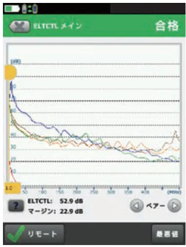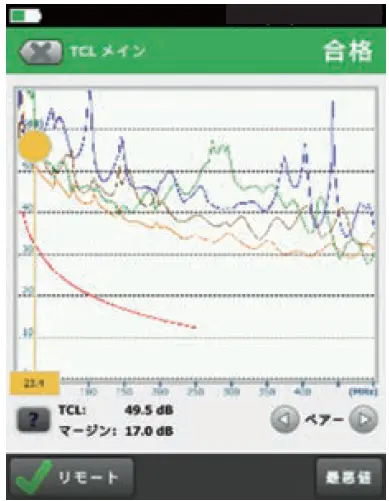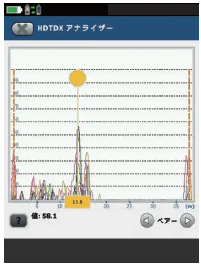 TDX(Time Domain Crosstalk)解析表示:トラブルシューティングに用いられる機能で、ケーブル内のどの位置で漏話が発生しているかを時間軸で特定可能。施工不良やコネクタ成端不良の位置を把握するのに役立ちます。