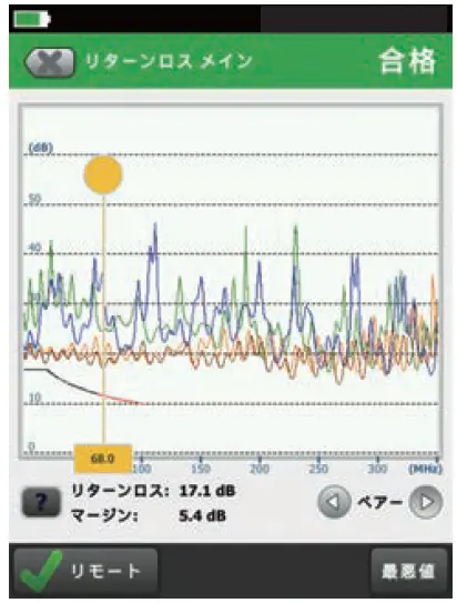 設置業者としては、ケーブルのすべてのテスト結果が「合格」となることが理想です。しかし、施工方法・部材の品質・テスターの性能などが影響し、結果が 「マージナルパス(Marginal Pass)」 となる場合があります。