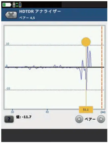 TDR(Time Domain Reflectometry)解析表示:本図は、ケーブル内のどの位置でインピーダンスの変動が発生しているかを時間軸で特定する画面を示しています。施工不良やコネクタ成端不良の位置を把握するのに役立ちます。