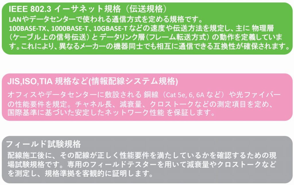 • フィールド試験規格:施工後の配線が要件を満たしているかを確認