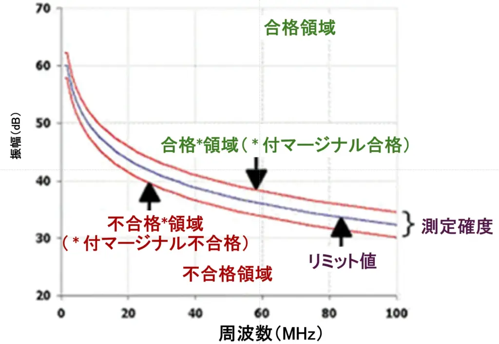 マージナル合格と不合格領域の関係:本図は、規格限界値と測定確度を考慮した合否判定の境界を示しています。マージナル合格は「規格上は合格」と見なされますが、測定誤差や施工状態によって将来的なリスクを含む可能性があります。